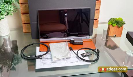 Większość monitora ma bardzo małą grubość, zaledwie 5 mm. Jest to całkiem porównywalne do standardowej pokrywy laptopa. Pogrubienie znajduje się w dolnej części, gdzie znajduje się cała elektronika i złącza. Po prawej stronie znajdują się MiniHDMI, gniazdo audio 3,5 mm i USB Type-C (Display Port). Może on służyć zarówno do przesyłania sygnału, jak i zasilania: