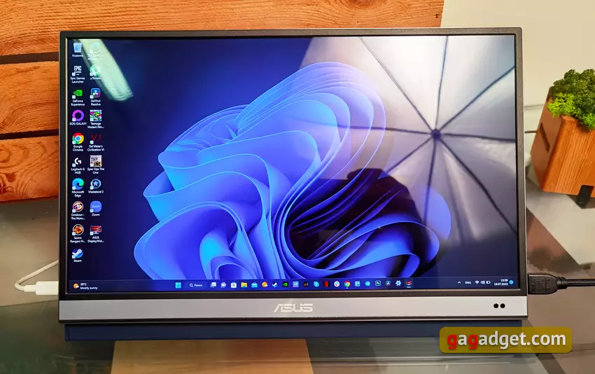 Większość monitora ma bardzo małą grubość, zaledwie 5 mm. Jest to całkiem porównywalne do standardowej pokrywy laptopa. Pogrubienie znajduje się w dolnej części, gdzie znajduje się cała elektronika i złącza. Po prawej stronie znajdują się MiniHDMI, gniazdo audio 3,5 mm i USB Type-C (Display Port). Może on służyć zarówno do przesyłania sygnału, jak i zasilania: