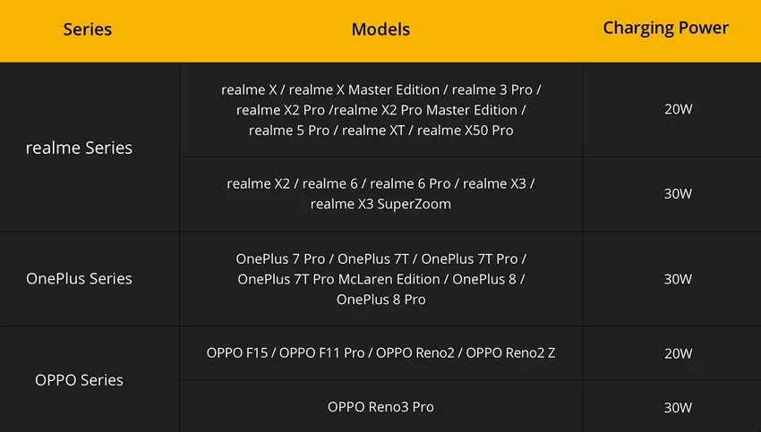 Nowością realme zainteresują się również użytkownicy smartfonów Oppo i OnePlus, ponieważ markowe szybkie ładowarki tych marek bazują na tej samej technologii. Zmienia się tylko nazwa - Dart Charge, VOOC lub Warp Charge. W tym przypadku mówimy o standardowej wersji o mocy wyjściowej 30 W, choć w przypadku poprzednich modeli może być ona ograniczona do 20 W. Dla ułatwienia zostawimy tabelkę objaśniającą ze strony producenta: