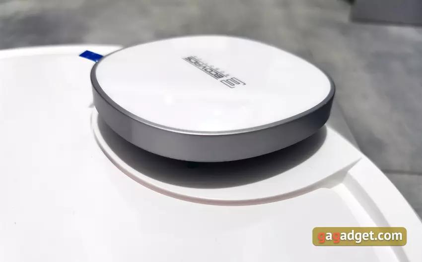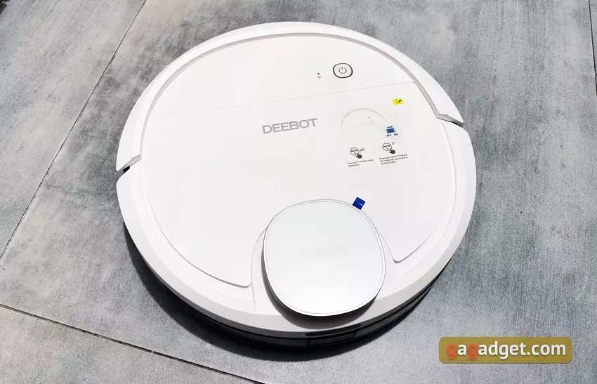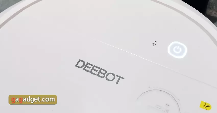 Ecovacs DEEBOT OZMO 900 jest całkowicie wykonany z tworzywa sztucznego i ma prawie okrągły kształt. Górna część jest biała. Na niej jest logo DEEBOT, jedyny przycisk zasilania z wbudowaną diodą LED, który może świecić na biało lub czerwono (w tym drugim przypadku jest to błąd lub rozładowana bateria). Obok niego znajduje się wskaźnik połączenia bezprzewodowego.