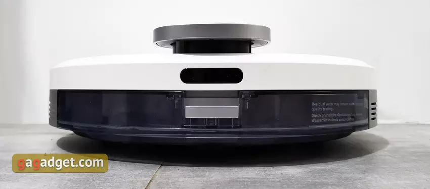 Na dole robota znajduje się wiele interesujących rzeczy. Po bokach znajdują się dwa duże gumowane koła napędowe, z przodu - małe koło z możliwością obrotu o 360 °. Po bokach znajdują się pola kontaktowe do ładowania. Na obwodzie umieszczono pięć czujników, aby zapobiec spadnięciu ze shodów (jeden z przodu i dwa z każdej strony). Z tyłu robota znajduje się platforma do mocowania tkaniny do czyszczenia na mokro. Niemal pośrodku znajduje się otwór ssący i wyjmowana szczotka główna.