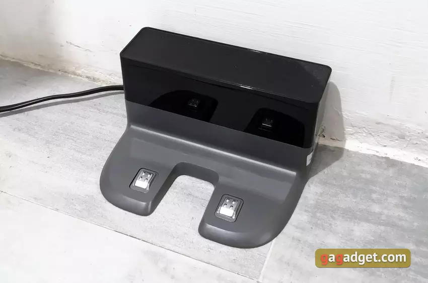 Stacja ładująca jest niewielka i ma ciemnoszary kolor. Zaleca się montaż z marginesem 50 cm po bokach i 1,5 m z przodu. Chociaż w rzeczywistości nie jest to krytyczne, wystarczy trochę mniej miejsca. W samej stacji dokującej znajdują się dwa pola kontaktowe do ładowania i nadajniki podczerwieni, dzięki czemu robot je „znajduje”.