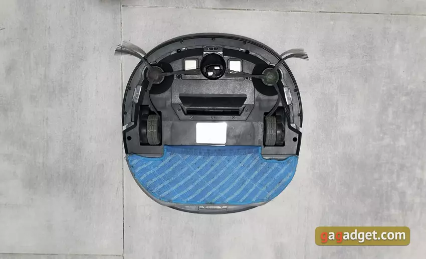 Najciekawsze jest na dole gadżetu. Po bokach są dwa duże gumowane koła, którymi napędza się DEEBOT OZMO Slim10. Z przodu - mniejsze koło, ale może obracać się o 360 °. Po bokach znajdują się pola kontaktowe, którymi robot jest ładowany ze stacji dokującej. Z przodu i po bokach zainstalowane są trzy czujniki, które zapobiegają spadnięciu robota ze schodów. Pośrodku znajduje się bezpośrednio otwór ssący, a z tyłu platforma, na której zamocowana jest mikrofibra do czyszczenia na mokro.