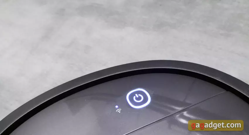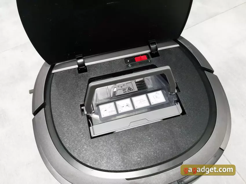 Górna pokrywa jest uchylna, pod nią znajduje się pojemnik na kurz, suwak zasilania i mały przycisk, który jest odpowiedzialny za połączenie z siecią bezprzewodową i całkowite przywrócenie ustawień fabrycznych.
