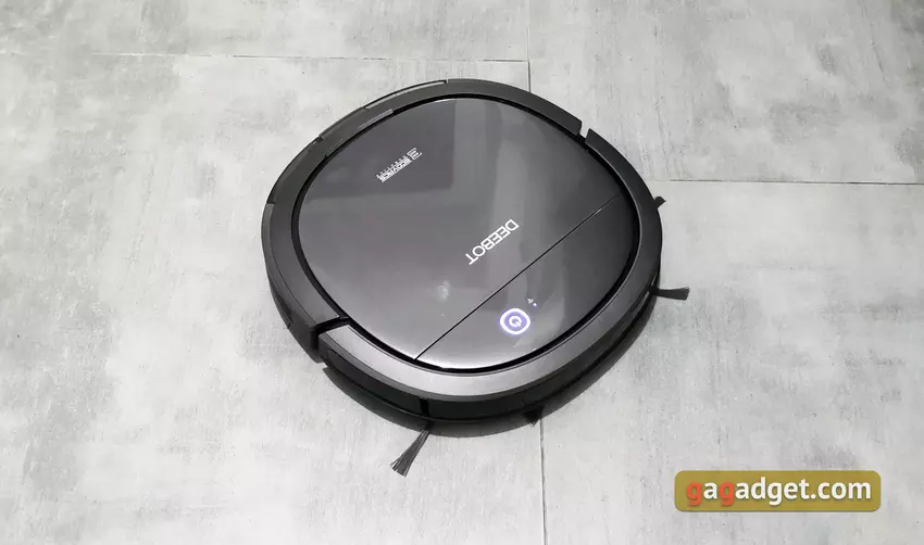 Robot wykonany jest głównie z ciemnoszarego plastiku, błyszczącego i matowego. Wygląda bardzo przyzwoicie, a jednocześnie spokojnie i neutralnie. Na górnej pokrywie znajdują się logo Ecovacs i DEEBOT, duży przycisk zasilania z wbudowaną diodą LED i symbol połączenia bezprzewodowego, również z diodą LED. Dioda LED na przycisku zasilania działa jako wskaźnik działania, ładowania, rozładowanego akumulatora i wszelkich błędów (miga na czerwono w dwóch ostatnich przypadkach).