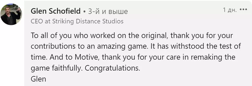 Twórca Dead Space Glen Schofield był zadowolony z remake'u swojej gry i podziękował EA Motive za ostrożne obchodzenie się z aktualizacją horroru