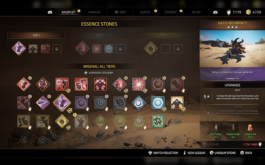 Kamienie można również ulepszać, aby zwiększyć ich wydajność. Aby to zrobić, musisz zebrać wszystkie rodzaje roślin i rudy, które są rozrzucone po całym świecie gry. Aby być bardziej stylowym w Atlasie, będziesz musiał ulepszyć swoją zbroję. Oczywiście nie jest to Wiedźmin i nie należy spodziewać się dziesiątek różnych pancerzy, ale twórcy przygotowali kilka ciekawych zestawów. Część z nich otrzymamy wraz z postępami w fabule, część będzie można kupić w sklepie, a resztę trzeba będzie znaleźć wykonując dodatkowe zadania. Każda zbroja ma swoje unikalne cechy. Jeden zestaw poprawia obronę, podczas gdy drugi zwiększa obrażenia, więc to od ciebie zależy, której zbroi użyjesz do wyzwolenia tego świata. Zestawy można również ulepszyć dwukrotnie na kowadle, używając esencji, która spada ze stworzeń i jest przyznawana za ukończenie zadań. Wszystkie inne przedmioty (w tym zbroje) kupuje się za złoto, które jest rozrzucone wszędzie.