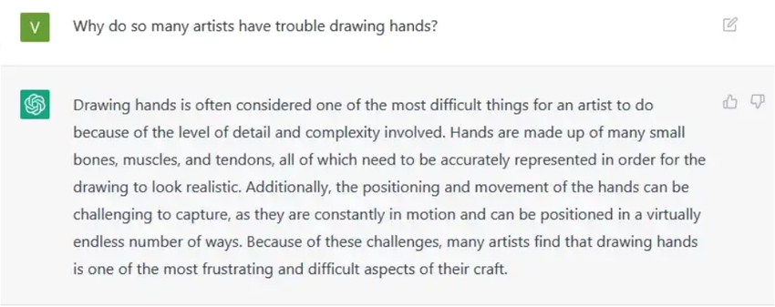A jeśli zapytasz ChatGPT, dlaczego ludzie mają trudności z rysowaniem dłoni i palców, odpowie on następująco: "Rysowanie rąk jest często uważane za jeden z najtrudniejszych elementów do narysowania przez artystę ze względu na poziom szczegółowości i złożoności. Dłonie składają się z wielu małych kości, mięśni i ścięgien. I wszystkie muszą być dokładnie odwzorowane, aby rysunek był realistyczny. Dodatkowo pozycja rąk może być trudna do przekazania, ponieważ są one w ciągłym ruchu i mogą być ustawione na nieskończoną ilość sposobów. Z powodu tych trudności wielu artystów uważa rysunek odręczny za jeden z najbardziej frustrujących i wymagających aspektów swojego rzemiosła."