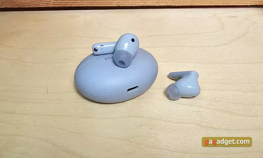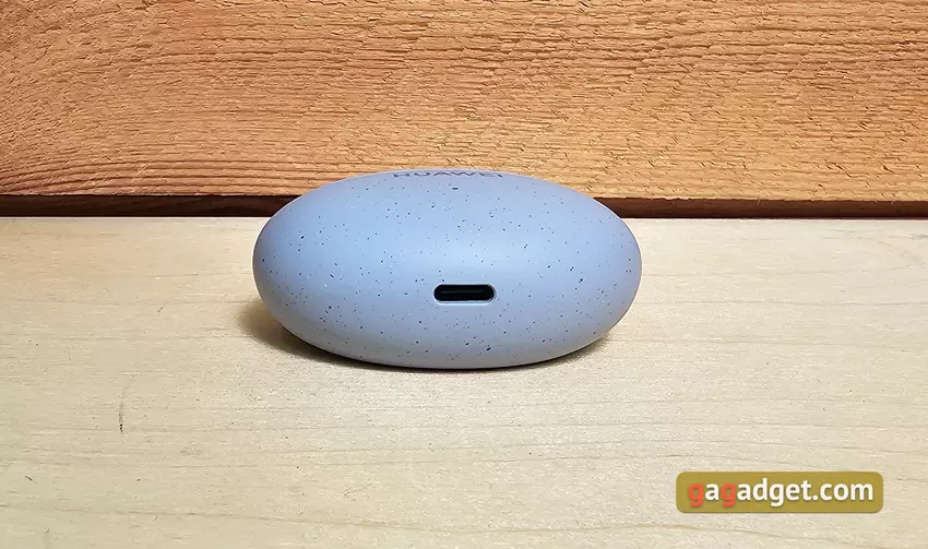 Etui do ładowania jest kompaktowe, owalne i płaskie. Waży zaledwie 33 g bez słuchawek. Można je dość wygodnie nosić w kieszeni, jest prawie niewidoczne. W niebieskiej wersji słuchawek etui ma przyjemną matową fakturę i małe ciemniejsze plamki. Dzięki temu przez długi czas będzie wyglądać schludnie. Na froncie znajduje się logo Huawei oraz wskaźnik LED informujący o trybie ładowania lub połączenia. Z boku znajduje się pojedynczy przycisk, który aktywuje tryb połączenia.