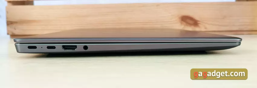 Chociaż nie ma wiele portów, wciąż jest ich więcej, niż w topowych ultrabookach. I to mi się podoba. Po lewej stronie znajdują się 2×USB 3.2 Gen1 Type-C z obsługą DisplayPort i Power Delivery (starszy model z Core i7 obsługuje również Thunderbolt 4), pełnowymiarowe HDMI 2.0 i połączone gniazdo audio 3,5 mm: