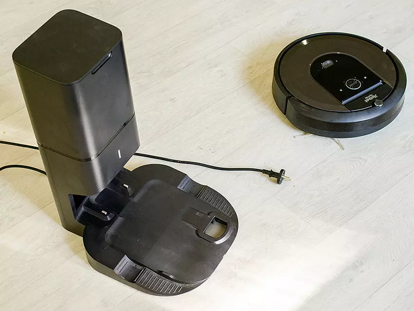 „Ciemna wieża” zawarta w zestawie, która jest tym samym „plusem” w nazwie modelu, w rzeczywistości zapewnia kluczową cechę Roomba i7 +, czyli możliwość niezależnego czyszczenia dużych powierzchni. W tym celu do stacji wbudowana jest nie tylko ładowarka, ale także potężna pompa i jednorazowy worek na śmieci zawierający zawartość 30 kolektorów śmieci. Gdy pojemnik na śmieci jest pełny, robot wraca do bazy, gdzie śmieci są pompowane przez ten sam zawór na dnie do worka w ciągu kilku sekund i możesz kontynuować pracę. Jeśli poziom naładowania baterii spadnie poniżej wartości krytycznej, robot wróci również do bazy i będzie kontynuował czyszczenie po naładowaniu. Korzystając z tej metody czyszczenia kosza na śmieci, nie musisz brudzić rąk i wdychać kurz, strząsając go ręcznie. Ale musisz kupować torby regularnie.