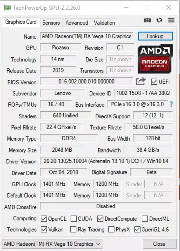 AMD Ryzen 7 3700U ma zintegrowaną kartę graficzną AMD Radeon RX Vega 10, która została przystosowana do użycia w energooszczędnych APU. Vega 10 zawiera 10 stron wykonawczych (640 shaderów), 8 bloków rasteryzacji (ROP), 40 bloków tekstur. Częstotliwość robocza wynosi 1400 MHz. Obsługiwane są DirectX 12, OpenGL 4.6, Open CL 2.0 i Vulkan 1.1. Jest to dość potężne rozwiązanie (jak w przypadku zintegrowanej grafiki), ale nie należy się spodziewać cudów: starsza gra będzie działać bez problemów, ale w nowoczesnych ustawieniach graficznych wciąż trzeba ją obniżyć. Pamięć RAM w laptopie to 8 GB DDR4-2400. Jeden pasek jest wlutowany na płycie, drugi pasek 4 GB zajmuje jedno gniazdo. Laptop obsługuje do 12 GB pamięci RAM. Interfejsy bezprzewodowe: Wi-Fi 802.11 AC (2x2) i Bluetooth 4.2.
