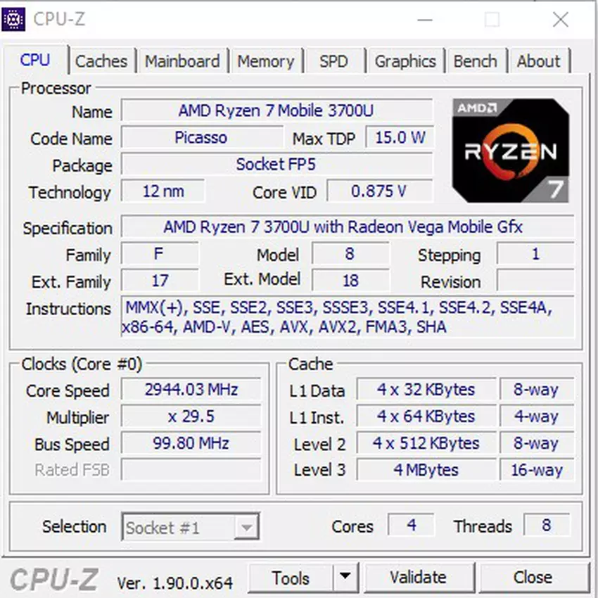 A teraz przejdziemy do najciekawszego - nadziania dla laptopa. Na początku stycznia AMD oficjalnie wprowadziło nową linię procesorów mobilnych, generację APU Picasso z serii Ryzen 3000. Korzystają z architektury Zen + i są wytwarzane zgodnie z technologią procesową 12 nm. W naszym teście został zainstalowany starszy model Ryzen 7 3700U, który zastąpił AMD Ryzen 7 2700U. Procesor jest wyposażony w 4 rdzenie i może jednocześnie przetwarzać do 8 strumieni danych. Podstawowa częstotliwość wynosi 2,3 GHz, a maksymalna to 4,0 GHz. Pamięć podręczna L3 4 MB, obsługuje pamięć dwukanałową o częstotliwości do 2400 MHz. Procesor TDP - 15 watów.