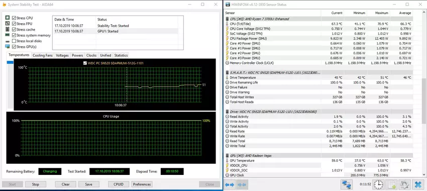 Z jakiegoś powodu AIDA64 odmówił odczytów z czujników temperatury laptopa, ale na ratunek przyszła aplikacja HWiNFO64. Jak się okazało, nowy procesor mobilny AMD jest bardzo „fajny”. Tak, oczywiście, nie zapomnij o systemie chłodzenia, który działa bardzo skutecznie w laptopie. Są jednak szczególnie „gorące” próbki, z którymi żaden SO nie może sobie poradzić. W takim przypadku, nawet przy przedłużonym maksymalnym obciążeniu, temperatura procesora nie wzrośnie powyżej 71 °. Oczywiście nie można mówić o dławieniu. Układ graficzny na szczycie miał w ogóle 63 °. Jednocześnie działanie wentylatora jest prawie niesłyszalne: