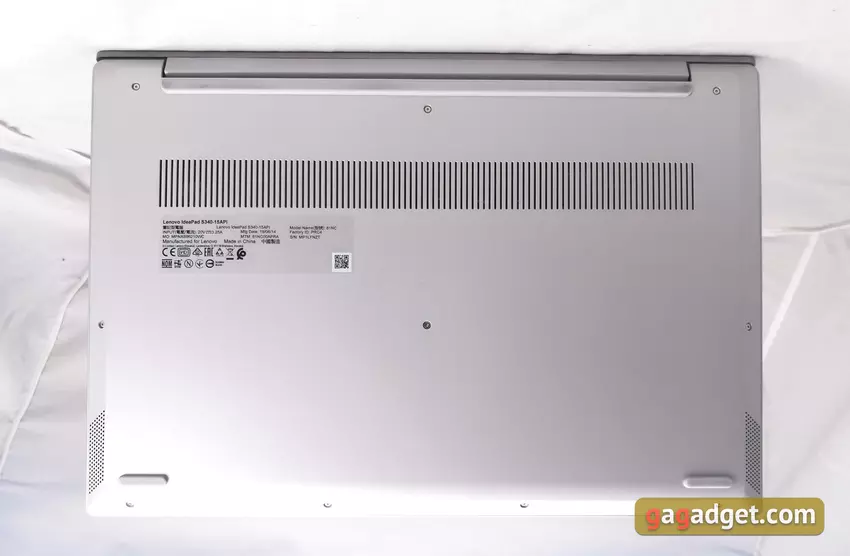 Na zewnątrz nie ma żadnych skarg na Lenovo IdeaPad S340, jest to całkowicie spokojna i wszechstronna maszyna. Czego nie można powiedzieć o montażu i materiałach obudowy. Ogólnie rzecz biorąc, jest trochę niechlujstwa, niektóre szczegóły nie są najlepiej dopasowane. Co więcej, sam projekt nie ma sztywności: laptop wygina się, jeśli podnosisz go za jeden koniec. Laptop nie może pochwalić się rekordowymi wymiarami ani wagą, ale jest dość przenośny: 358 x 245 x 17,9 mm, 1,8 kg.