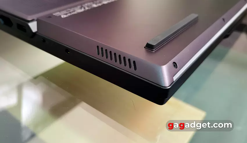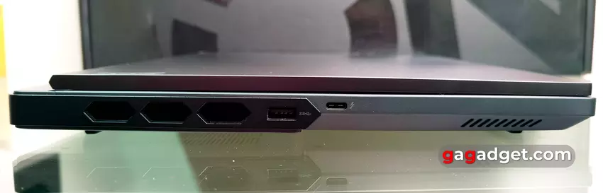 Na krawędziach znajduje się wiele dużych sześciokątnych otworów wentylacyjnych. Jest to całkiem normalne w przypadku potężnego modelu do gier. Jest też wiele złączy, które znajdują się po bokach i z tyłu. Po lewej stronie znajdują się USB-A 3.2 Gen 1 i USB-C 3.2 Gen 2 z obsługą DisplayPort 1.4 i 140W Power Delivery. Dzięki odpowiedniemu zasilaczowi można używać laptopa do pracy biurowej bez konieczności noszenia ze sobą dużego zasilacza o mocy 330 W. Ale oczywiście laptop nie będzie działał z pełną wydajnością.