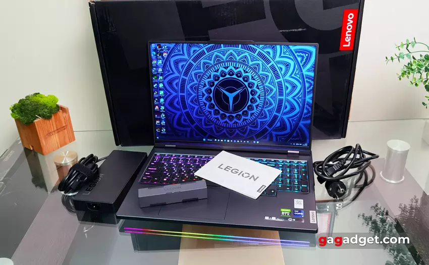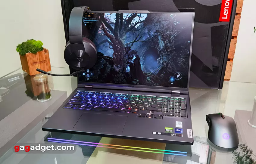 Wewnątrz Lenovo Legion Pro 7 ma jedne z najpotężniejszych komponentów, jakie można znaleźć w nowoczesnym flagowym laptopie do gier. Procesor to 24-rdzeniowy potwór Intel Core i9-13900HX. Ten procesor Raptor Lake 13. generacji, wyprodukowany przy użyciu procesu Intel 7, zawiera 8 wysokowydajnych rdzeni o częstotliwości od 2,2 do 5,4 GHz i 16 energooszczędnych rdzeni o częstotliwości od 1,6 do 3,9 GHz. Obsługuje do 32 wątków, a pamięć podręczna trzeciego poziomu wynosi 32 MB. Poziom TDP wynosi 55 W z możliwym krótkoterminowym wzrostem do 157 W. W przypadku Lenovo Legion Pro 7 pod dużym obciążeniem moc może osiągnąć około 135 W. Wbudowany układ graficzny Intel UHD Graphics ma 32 jednostki obliczeniowe i częstotliwość do 1,65 GHz. Dyskretna karta graficzna to flagowa NVIDIA GeForce RTX 4090 Laptop o mocy 150W TGP plus 25W Dynamic Boost. Standardowa częstotliwość wynosi 1455 MHz, a częstotliwość Boost 1605 MHz. Ilość pamięci wideo wynosi 16 GB GDDR6. Dostępny jest multiplekser MUX Switch, który umożliwia przełączanie dyskretnej karty graficznej bezpośrednio na wyświetlacz, a nie przez zintegrowaną kartę, która wymaga ponownego uruchomienia po aktywacji. Obsługuje również technologię NVIDIA Advanced Optimus, która działa w hybrydowym trybie wydajności (włączonym w aplikacji Lenovo Vantage), automatycznie przełącza się między kartami graficznymi i nie wymaga ponownego uruchamiania. Ilość pamięci RAM wynosi 32 GB DDR5-5600 MHz. Zastosowano dwie taśmy 16 GB, nie są one wlutowane, więc możliwa jest rozbudowa. Karta bezprzewodowa to Killer AX1675i z obsługą Wi-Fi 6E (802.11ax) (Dual band) 2x2 i Bluetooth 5.1. Istnieje również gigabitowy Ethernet dla połączenia przewodowego. Lenovo wspomina również o zastosowaniu w laptopie układu LA-2Q AI do uczenia maszynowego. Twierdzi się, że dzięki czujnikom na komponentach laptopa i technologii Smart Engine laptop optymalizuje wydajność w czasie rzeczywistym. A dzięki wspomnianemu uczeniu maszynowemu z czasem robi to jeszcze lepiej. Nie ma praktycznych sposobów, aby to zweryfikować, więc będziesz musiał po prostu uwierzyć Lenovo na słowo.