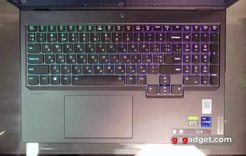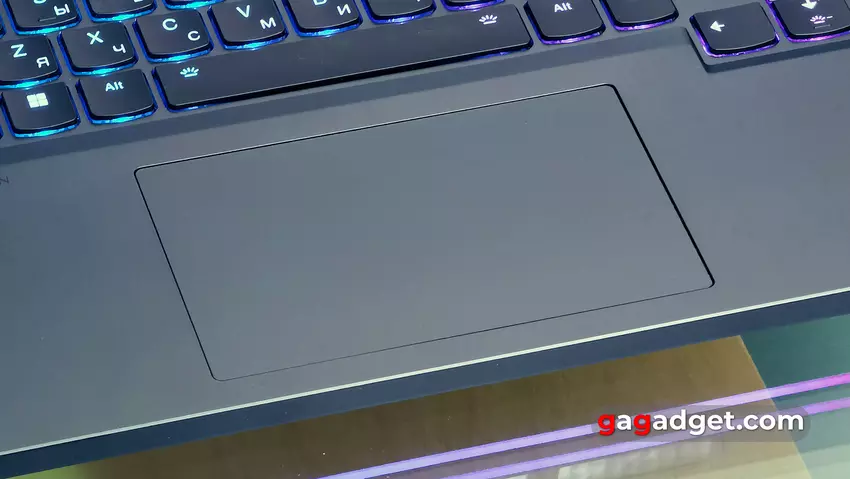 Klawiatura zajmuje prawie całą szerokość powierzchni roboczej i ma standardowy układ z dodatkowym blokiem numerycznym. Jedyną osobliwością układu jest zmniejszony rozmiar przycisków funkcyjnych, który kończy się na przyciskach sterowania multimediami. Blok strzałek jest pełnowymiarowy i nieco przesunięty bliżej użytkownika. Oba klawisze Shift są długie. Nie ma więc prawie żadnych nietypowych momentów, a przyzwyczajenie się do nich zajmuje minimum czasu. Przycisk zasilania z wbudowaną diodą LED znajduje się nad klawiaturą. Z jakiegoś powodu Lenovo zdecydowało się całkowicie zrezygnować z biometrycznych metod odblokowywania laptopa w Legion Pro 7. Nie ma czujnika linii papilarnych ani kamery na podczerwień.