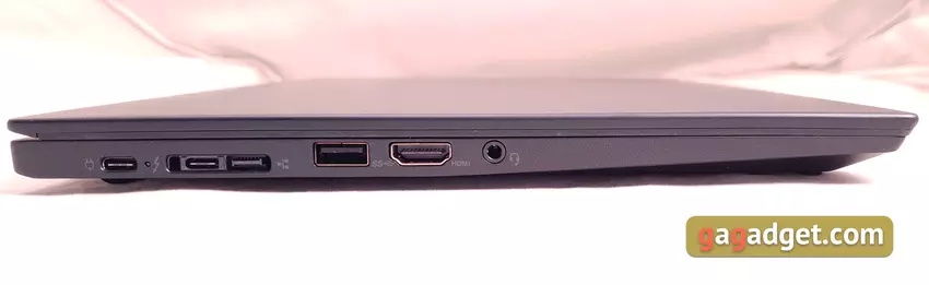 Po lewej stronie znajdują się dwa USB Type-C 3.1: jeden z obsługą Power Delivery do ładowania za pomocą diody LED, a drugi z obsługą Thunderbolt 3. Drugi Type-C znajduje się obok zastrzeżonego portu Ethernet, w jednej wspólnej wnęce, do której można podłączyć zastrzeżoną stację dokującą. Niestety w zestawie nie ma adaptera do standardowego RJ-45, a byłby bardzo przydatny w biznesowym laptopie. Następny jest pełnowymiarowy USB 3.0 i HDMI: