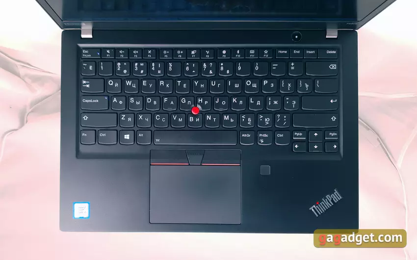 Zawiasy pozwalają otworzyć laptop o 180 ° i dobrze zamocować ekran we właściwej pozycji. Jednocześnie laptop otwiera się bez problemów jedną ręką. Układ klawiatury i elementów funkcjonalnych jest znany z poprzednich ThinkPadów: przycisk zasilania jest okrągły, z diodą LED. Umieszczony nad klawiaturą. Skaner linii papilarnych znajduje się po prawej stronie touchpada, zgubił diodę LED. Górny rząd przycisków F ma nieco zmniejszoną wysokość, na końcu wiersza znajdują się osobne przyciski Początek, Koniec i Usuń. PgUp i PgDn znajdują się po bokach strzałki w górę, a PrtSc znajduje się między prawymi przyciskami Alt i Ctrl. Trackpoint znajduje się między przyciskami G, H i B, a nad touchpadem znajdują się trzy dodatkowe przyciski. Co jest trochę denerwujące - Fn i Ctrl zmieniły miejsca, takie rozwiązanie było od dawna stosowane w ThinkPad. Ale wcześniej ich przyznaczenie można było zmienić za pomocą Lenovo Vantage, teraz z jakiegoś powodu postanowili usunąć tę możliwość. Nie jest to krytyczne, ale przyzwyczajenie się do tego będzie potrzebne: