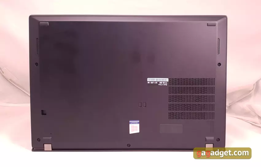 Od dółu - otwory w układzie chłodzenia, głośniki stereo, kilka otworów do zamocowania stacji dokujących, otwór do zrzutu laptopa i cztery gumowe nóżki. Tylne są nieco większe i wyższe, dzięki czemu powierzchnia robocza laptopa jest lekko nachylona w kierunku użytkownika: