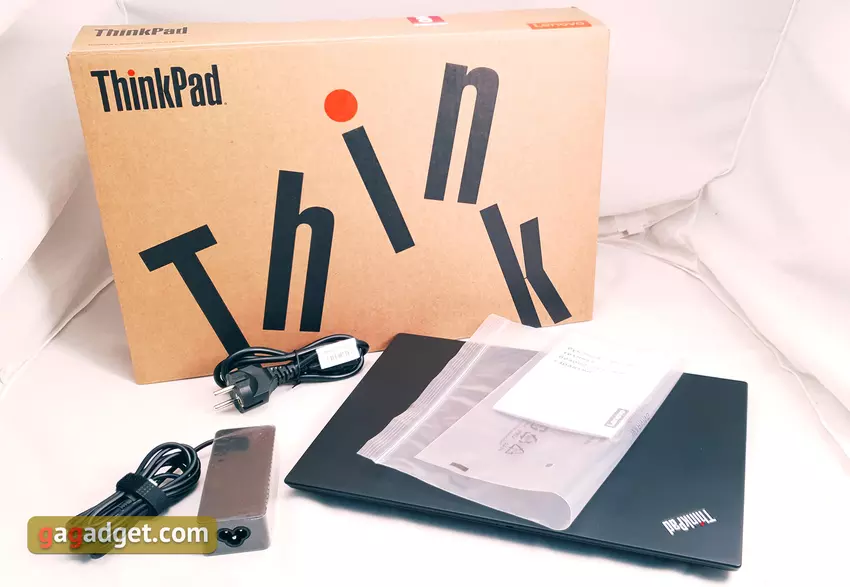 Lenovo ThinkPad T490s jest zapakowany w standardowe żółte pudełko kartonowe z nazwą linii i podstawowymi informacjami technicznymi. W środku jest tylko niezbędne minimum: laptop, stosunkowo kompaktowy zasilacz 65 W, kabel zasilający i dokumentacja: