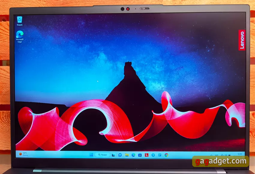 Ramki wokół ekranu są dość cienkie. Moduł kamery internetowej znajduje się w swoim zwykłym miejscu. Ma rozdzielczość FullHD i jest wyposażony w fizyczną migawkę. Obok znajduje się wskaźnik jej działania, a także kamera na podczerwień służąca do identyfikacji właściciela laptopa.