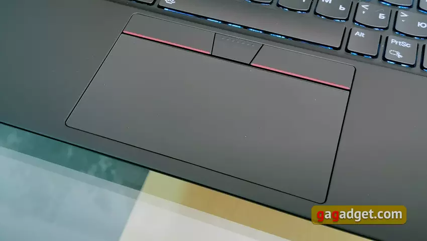 Touchpad nie jest zbyt duży: ma 110 mm szerokości. Jest szklany, o przyjemnej powierzchni i doskonałej czułości. Jest wystarczający do zdecydowanej większości zadań i nie ma krytycznej potrzeby korzystania z myszy. Nad touchpadem znajdują się trzy dodatkowe przyciski do obsługi trackpointa.