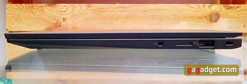 Modele ThinkPad zawsze mają dobry zestaw złączy. Lenovo ThinkPad X1 Carbon Gen 11 nie jest wyjątkiem. Po prawej stronie znajduje się gniazdo audio 3,5 mm, gniazdo nanoSIM (istnieją konfiguracje z modemem mobilnym i bez niego), jedno USB Type-A 3.2 Gen 1 i gniazdo Kensington Nano Security Slot: