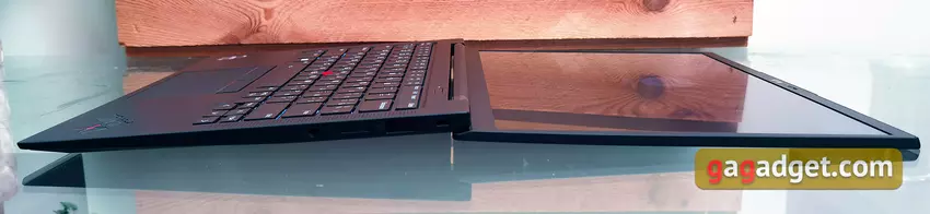 Obudowa nadal wykonana jest ze stopu magnezu i włókna węglowego. Dzięki zastosowanym materiałom obudowa jest bardzo wytrzymała i lekka. Laptop jest dostępny w dwóch opcjach wzorniczych: z teksturą włókna węglowego lub bardziej znaną czarną pokrywą z matowym wykończeniem, która jest bardzo podobna do Soft Touch. Mieliśmy tę drugą opcję. Wygląda i jest bardzo ładna, ale zbiera trochę odcisków palców. W prawym dolnym rogu górnej pokrywy znajduje się małe logo Lenovo, a w lewym górnym rogu logo ThinkPad z czerwonym wskaźnikiem LED.