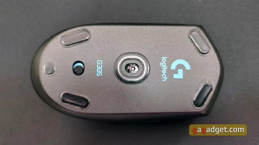 Pośrodku dolnej części myszy znajduje się czujnik optyczny z otworem z teflonową krawędzią. Poniżej znajduje się nazwa modelu i suwak włączenia. Wzdłuż obwodu - pięć małych nóg o przyzwoitej grubości: