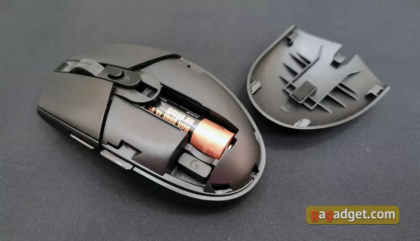 Pojedyncza dioda LED znajduje się obok przycisku przełącznika DPI. Zapala się w różnych kolorach podczas przełączania trybów i informuje, że bateria jest niska (poniżej 15%). W pobliżu górnej pokrywy znajdują się dwa punkty do jej usunięcia: