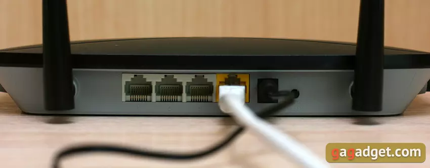 Cztery porty do podłączania kabli sieciowych znajdują się z tyłu, jeden z nich to „przychodząca” sieć WAN. W pobliżu znajduje się tylko złącze zasilania i przycisk resetowania. Złącza Ethernet są rozmieszczane „stroikami” w górę, a nie w dół. Nie jest to zbyt wygodne rozwiązanie; wyłączeniu krosownic trochę przeszkadza występ osłony obudowy.