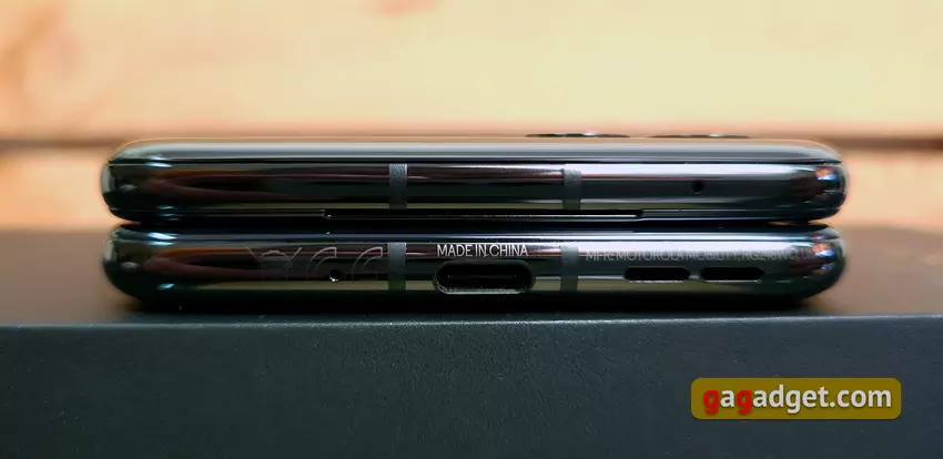 Obie połówki są chronione przez Gorilla Glass Victus, ale są wykończone w zupełnie inny sposób. Dolna część ma bardzo ładną matową fakturę i ciekawie mieni się w słońcu. Pośrodku znajduje się logo Motoroli, a poniżej stylizowany napis Razr.