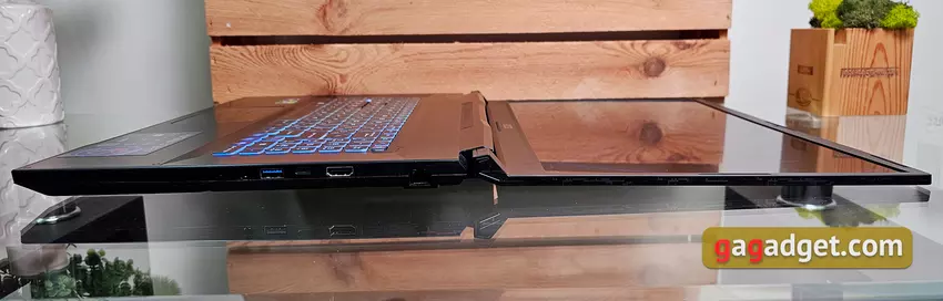Przednia krawędź laptopa nie posiada żadnych funkcjonalnych elementów. Tył ma dwie strefy do wydmuchiwania gorącego powietrza przez układ chłodzenia i zawiasy.