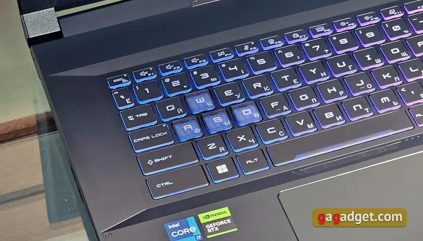 MSI Katana 17 B12V ma pełnowymiarową klawiaturę z dodatkowym blokiem numerycznym, ale z kilkoma nietypowymi funkcjami. Biorąc pod uwagę szerokość laptopa, można go było uczynić nieco szerszym i bardziej znanym. Górny rząd ma zwykle zmniejszoną wysokość i kończy się przezroczystym przyciskiem zasilania z wbudowaną diodą LED. Przyciski WASD są również przezroczyste. Lewe klawisze Shift i Ctrl są nieco dłuższe niż standardowo, ale to sprawiło, że zrezygnowaliśmy z przycisku Fn. Znajduje się on tylko po prawej stronie głównego bloku, co nie jest zbyt wygodne podczas korzystania z klawiszy funkcyjnych. Enter to jednopoziomowy długi klawisz. Blok nawigacyjny nie jest oddzielony od głównego bloku i ma przyciski o standardowym rozmiarze, co sprawiło, że prawy przycisk Shift jest nieco mniejszy. Klawiatura numeryczna matrzy, a nie cztery kolumny. Dodatkowy Enter znajduje się pod blokiem, a "+" i "-" nad nim, obok NumLock. Ogólnie rzecz biorąc, nie ma nic krytycznego, a dodatkowa klawiatura numeryczna może być przydatna podczas pracy. Przyzwyczajenie się do niego zajmuje jednak trochę czasu.