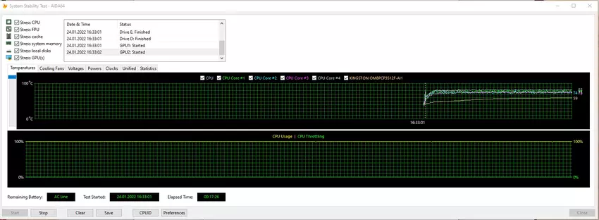 Cooler Boost 5 odpowiada za chłodzenie laptopa. zawiera 2 wentylatory, 6 rurek cieplnych i niezależny moduł termiczny dla CPU i GPU. Jednocześnie stosowane są rurki cieplne o cieńszych ściankach, dzięki czemu, możliwe było poszerzenie kanału wewnętrznego. Układ chłodzenia radzi sobie ze swoim zadaniem: nawet przy długotrwałych obciążeniach szczytowych, temperatura komponentów wewnątrz nie wzrasta powyżej 80-83 °. W związku z tym, nie obserwuje się trollingu. Obszar nad klawiaturą trochę się nagrzewa, podczas gdy reszta powierzchni roboczej pozostaje zimna. Pod względem poziomu hałasu, MSI Katana GF66 11UD to typowy laptop do gier. Tak, pod obciążeniem praca jest słyszalna, ale wszystko rozsądnych granicach.