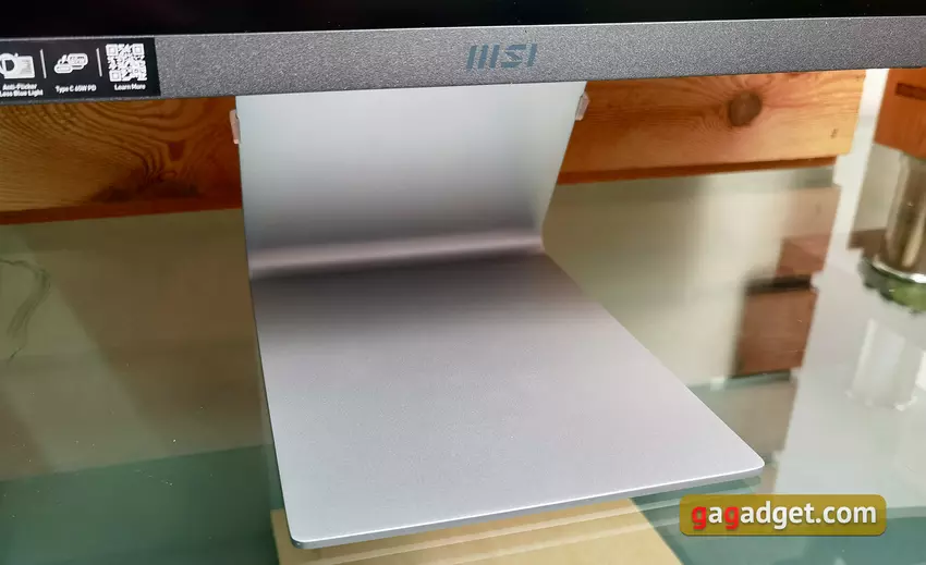 Podstawka ma prosty prostokątny kształt z zaokrąglonymi rogami i kątem nachylenia 64,4°. Wykonana jest ze srebrnego stopu aluminium. Jest wystarczająco ciężka i szeroka, aby bezpiecznie utrzymać monitor na biurku.
