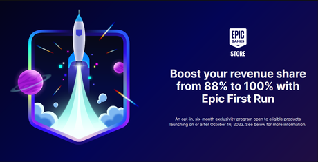 "Epic First Run" w programie Epic umożliwia publikowanie gier, które nie były jeszcze dostępne w innych sklepach PC. Przez pierwsze sześć miesięcy deweloper otrzyma 100% zysku z gry, a następnie 88%. Po sześciu miesiącach nikt nie zabrania umieszczania gry w innych sklepach. Epic Games obiecuje również, że takie gry będą umieszczane na stronie głównej, w kolekcjach oraz w autorskich artykułach. Aby zarejestrować się w programie, należy zapoznać się ze wszystkimi zasadami pod tym linkiem.