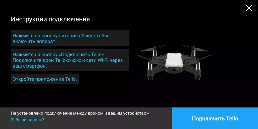 Aby sterować dronem musisz pobrać aplikację korporacyjną Tello (istnieją dla Androida i iOS ). Następnie włączyć drona (on ma jeden przycisk) i podłączyć do swojej sieci Wi-Fi.