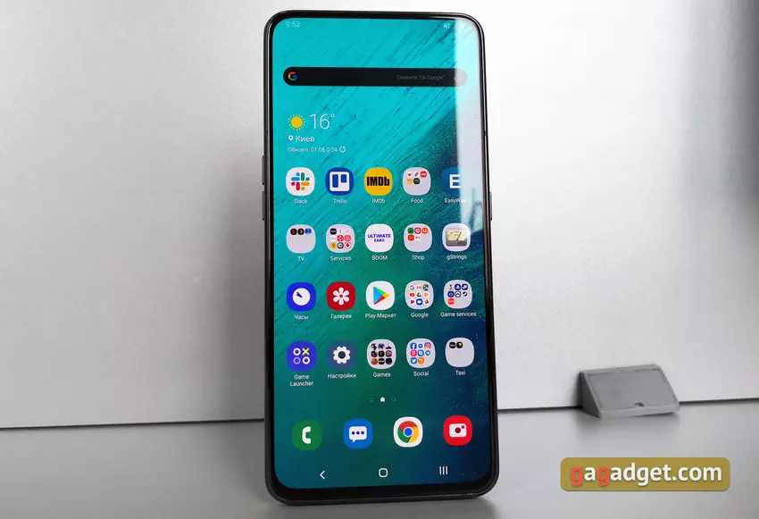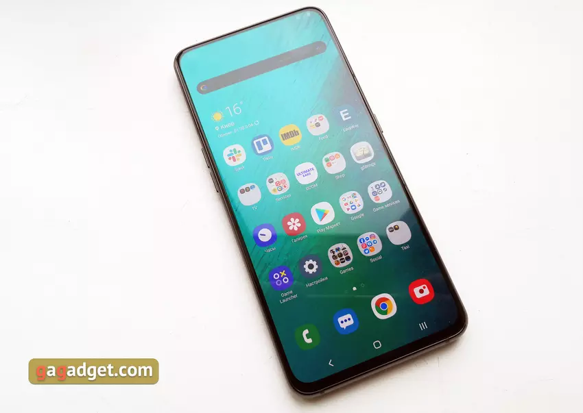 Główną interesującą cechą smartfona była niecodzienna konstrukcja z wysuwaną kamerą PTZ, co wyeliminowało potrzebę używania przedniej kamery i pozwoliło zainstalować wyświetlacz bez żadnych wycięć na całym panelu przednim. Cóż, efekt wow jest również obecny. Sama kamera składa się z trzech modułów: modnej 48-megapikselowej kamery głównej, 8-megapikselowej kamery szerokokątnej i kamer ToF do określania odległości od obiektów. Smartfon ma wyświetlacz SUperAMOLED o bardzo imponującej przekątnej 6,7 cala i rozdzielczości 2400 × 1080, a wewnątrz jest zainstalowany zupełnie nowy procesor Qualcomm Snapdragon 730 ze środkowego segmentu cenowego. Pamięć - 8 GB pamięci RAM i 128 GB pamięci wewnętrznej, bez gniazda karty pamięci. Skaner linii papilarnych jest umieszczony na ekranie.