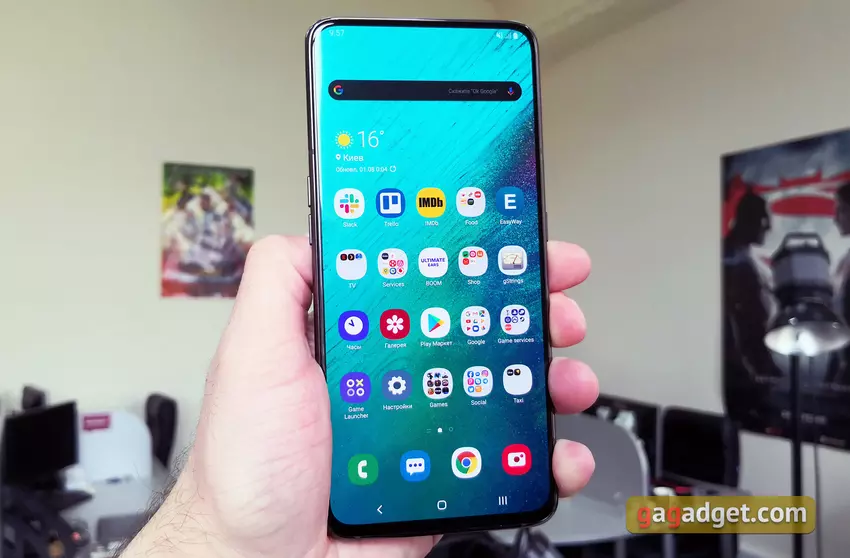 Smartfon ma ogromny 6,7-calowy ekran SuperAMOLED o rozdzielczości 2400 × 1080, współczynnik proporcji - 20: 9, gęstość pikseli - około 393 ppi. Wskaźnik jest średni, ale ogólnie nie wpływa na percepcję, w każdym razie nie mogłem rozróżnić poszczególnych pikseli. Obraz na ekranie jest doskonały, kąty widzenia są maksymalne, a margines jasności wystarcza na letnie słońce. Co ciekawe, ekran jest chroniony szkłem Gorilla 3. generacji (podczas gdy tył 6 generacji.). Istnieje funkcja Always on Display.