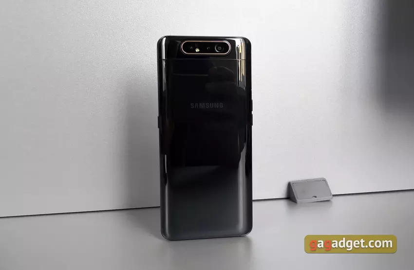 Ogólne wrażenie wyglądu Samsunga Galaxy A80 jest przyjemne. Wygląda nowocześnie, ekran jest ogromny, prawie bez ramek, kamera PTZ dodaje temu wyjątkowości. Ale wymiary i waga okazały się bardzo imponujące. Grubość smartfona wynosi 9,3 mm, a 220 g, nawet jak na standardy największych smartfonów, jest nieco dużo.