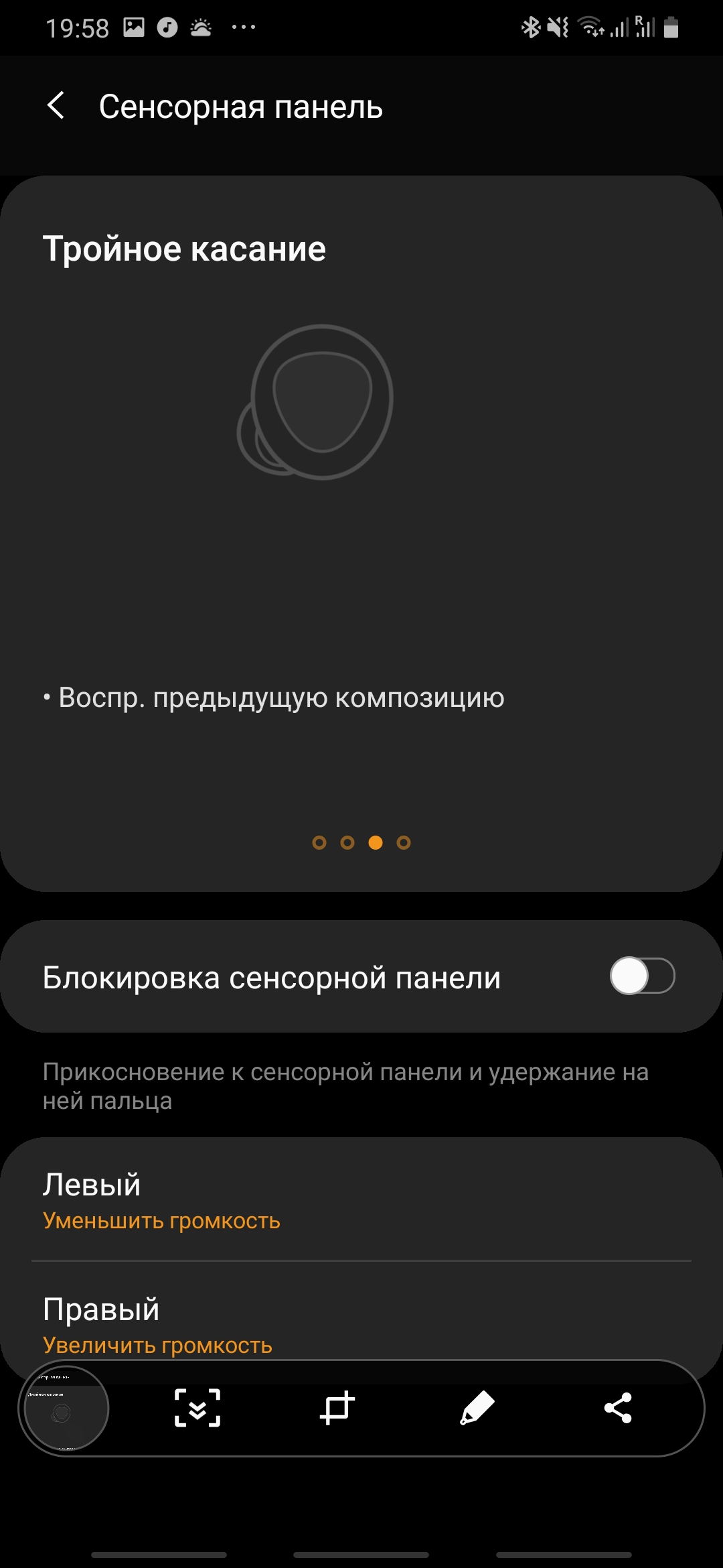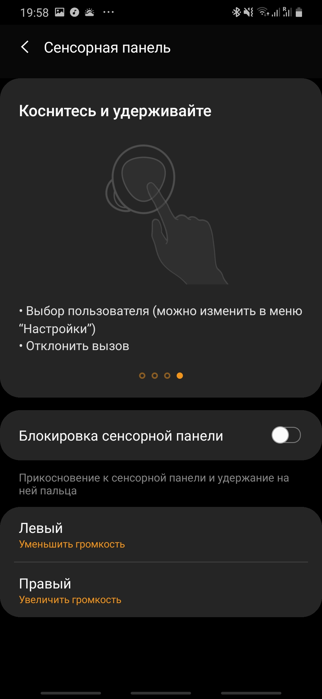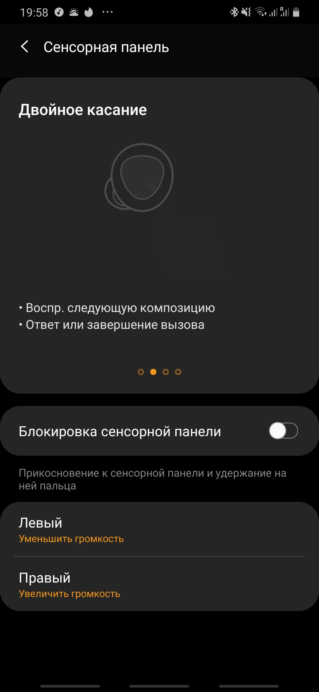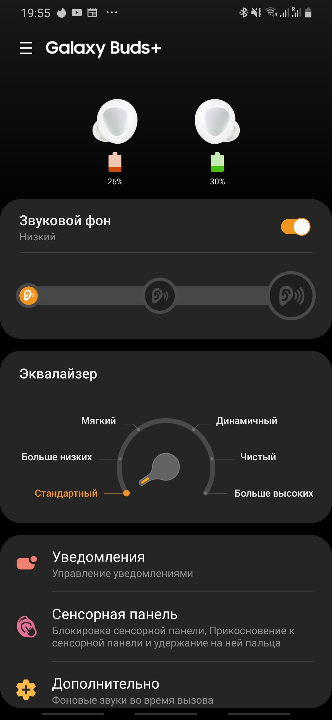 Po drugie, gesty sterujące zestawem słuchawkowym są natychmiast konfigurowane. Niektórych nie można zmienić, ale długie naciśnięcie - można. Możesz wybrać kontrolę głośności, wywołać sterowanie głosowe lub zmienić dźwięk w tle. Nawiasem mówiąc, wszystko jest bardzo dobre z gestami, słuchawki pozwalają zrobić prawie wszystko bez kupowania smartfona. Mogą nawet czytać wiadomości. Wszystko, czego nie można zrobić za pomocą gestów, jest możliwe za pomocą głosu.