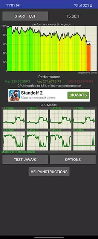 Ale podobnie jak poprzednia generacja, Samsung Galaxy Flip4 ma pewne problemy z przegrzewaniem się. Rzeczywiście, biorąc pod uwagę cechy konstrukcyjne, widać, że układ graficzny jest bardzo gęsty, a flagowe procesory są zawsze gorące. Test CPU Throttling wykazał, że procesor jest podatny na przegrzewanie się pod długotrwałym maksymalnym obciążeniem, a wydajność spada nawet o 65%. Obudowa staje się również odczuwalnie ciepła.