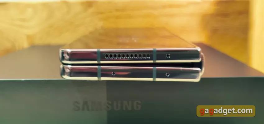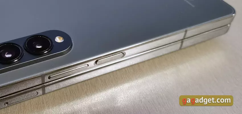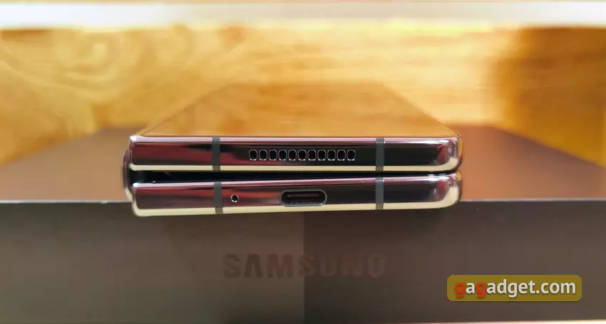 Ramka i maskownica smartfona wykonane są ze wzmocnionego, błyszczącego aluminium. Po złożeniu jest jeszcze szczelina w pobliżu zawiasu. Trudno powiedzieć, czy stała się ona mniejsza. Wszystkie elementy funkcjonalne pozostały w tych samych miejscach co w Fold3. Na dole znajduje się głośnik, złącze Type-C, mikrofon oraz plastikowe wstawki do stabilnej pracy anten.