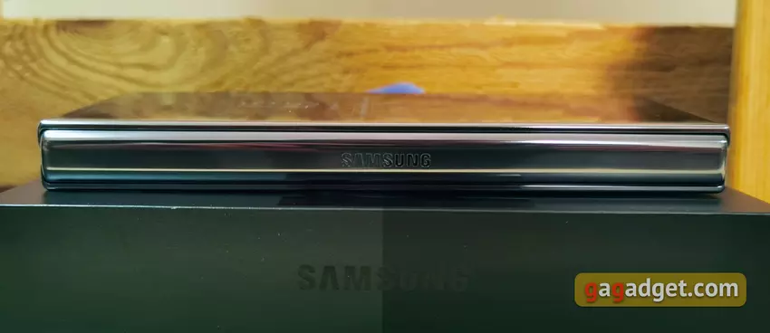 Metalowa pokrywa osłaniająca zawias jest błyszcząca z grawerem Samsunga, podobnie jak w poprzednim modelu.