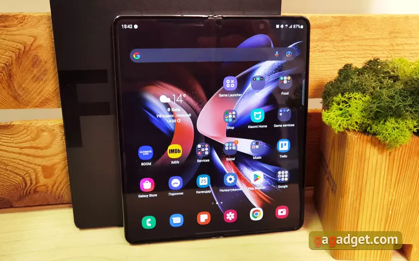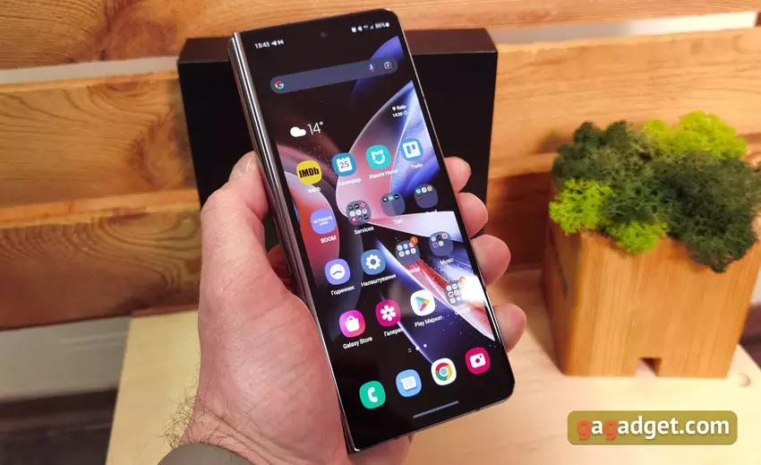 Linia Fold została opracowana z myślą o tym, aby była jak najbardziej zróżnicowana pod względem scenariuszy użytkowania. Zewnętrzny ekran wystarczy do wszystkich podstawowych funkcji (połączenia, wiadomości, komunikatory, aparat). Samsung Galaxy Fold4 w stanie złożonym jest łatwy i wygodny do manipulowania jedną ręką nawet w podróży. W stanie rozłożonym okazuje się faktycznie 7,6-calowym tabletem. Rzeczywiście, 7-calowe tablety były kiedyś normą. W tym formacie wygodnie jest surfować po sieci, pracować z dokumentami, pocztą. Osobno warto dodać o wygodnym multitaskingu. Możesz jednocześnie korzystać z trzech aplikacji, które można dowolnie przeciągać, sortować i zmieniać ich rozmiar. Takie presety można zapisać na pasku bocznym w celu szybkiego uruchomienia. W tym trybie na dole pojawia się panel jak w Windows 11 czy Mac OS z najczęściej używanymi aplikacjami do szybkiego uruchomienia. Można go ukryć lub wrócić na ekran długim dotknięciem.