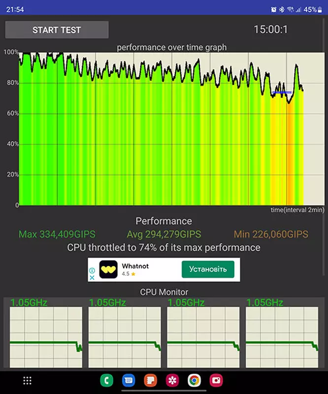 Test dławienia procesora wykazał, że smartfon lekko się przegrzewa przy długim maksymalnym obciążeniu. Pod koniec 15-minutowego testu wydajność może spaść do 74%, co nie jest krytyczne. Obudowa staje się ciepła. Jednak w normalnych warunkach, nawet podczas gry, smartfon pozostaje chłodny i nie ma problemów z wydajnością.