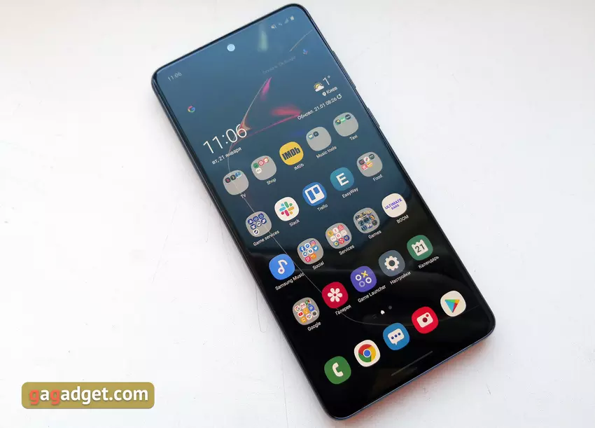Galaxy Note10 Lite jest wyposażony w wyświetlacz Super AMOLED o przekątnej 6,7 cala i rozdzielczości 2400 × 1080. Nieco mniejszy niż Galaxy Note10 + (6,8 cala) i większy niż Galaxy Note10 (6,3 cala), ale proporcje nowości są bardziej wydłużone: 20: 9 zamiast 19: 9. Gęstość pikseli wynosi 394 ppi, czyli nieco mniej niż w Note10 przy 401 ppi. W ustawieniach znajduje się standardowy zestaw: regulacja jasności, wybór rozmiaru czcionki, skala elementów interfejsu, niebieski filtr, ciemny motyw interfejsu, Always on Display, oświetlenie krawędzi (po otrzymaniu powiadomień) oraz dwa tryby wyświetlania kolorów: „naturalny” i „nasycony”. Ten ostatni ma możliwość regulacji temperatury barwowej. To wszystko, co widzieliśmy w poprzednich modelach Samsunga. Co ciekawsze, dostępna jest teraz ochrona przeciw migotaniu (ściemnianie DC w niektórych smartfonach). Wygląda na to, że pojawiła się z nową wersją oprogramowania. Ale nie ma tego w ustawieniach: działa domyślnie i nie można ją wyłączyć. Chociaż nie widzę wiele powodów, aby ją wyłączyć.